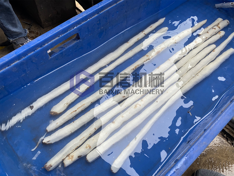 設(shè)備啟動(dòng)后將山藥從入料口處投入,通過(guò)送料機(jī)構(gòu)自動(dòng)帶動(dòng)白蘿卜向前移動(dòng)的同時(shí)經(jīng)過(guò)切刀組合進(jìn)行去皮加工。